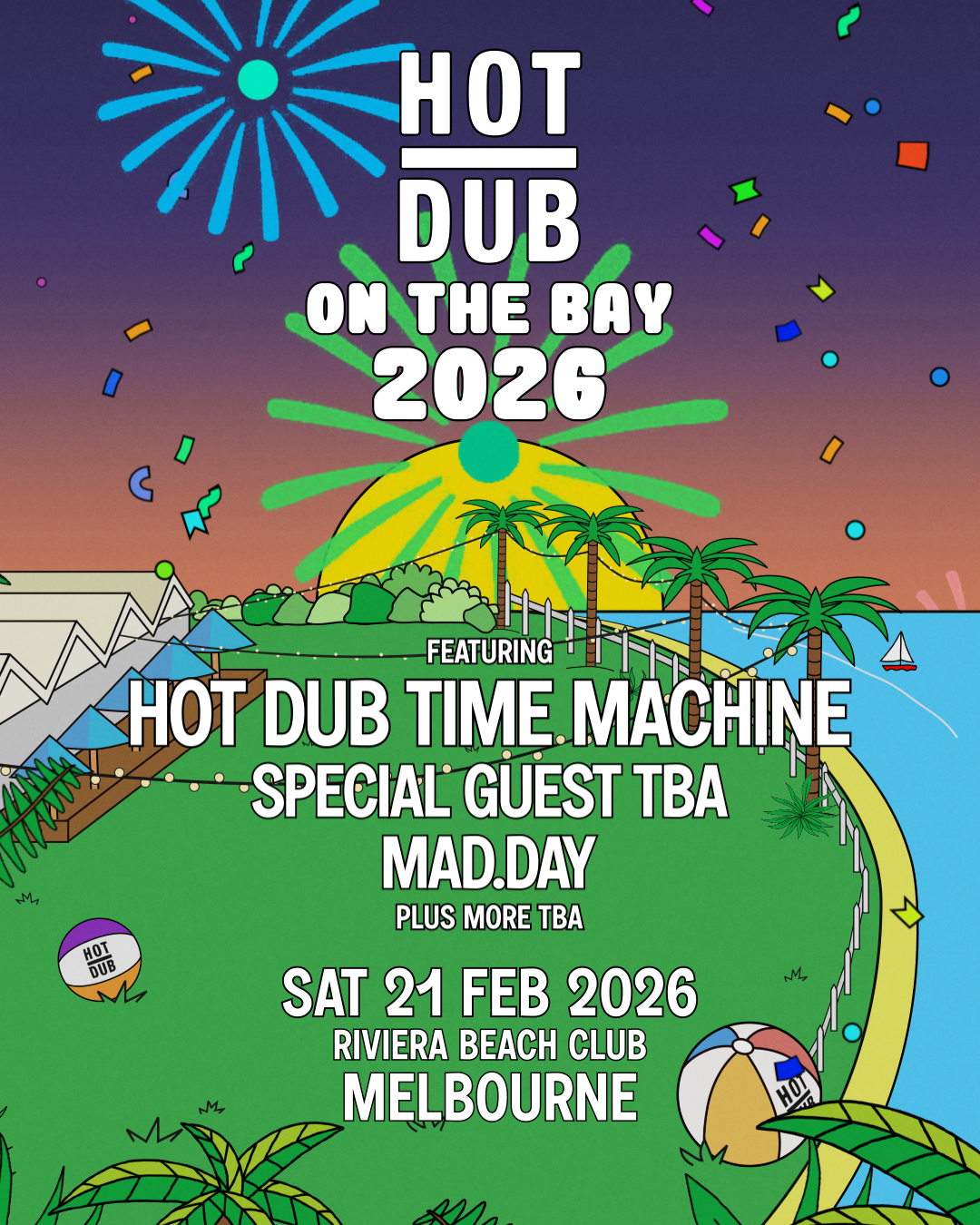 Hot Dub On The Bay returns to the Riviera Beach Club on Saturday 21 February 2026, after an unforgettable debut in 2025. Set against the palm-lined shores of St Kilda Marina, this is the ultimate Summer party ☀️ Get ready to dance through the decades as Hot Dub Time Machine spins the greatest party anthems of all time, from throwback classics to today’s biggest hits, all at this stunning waterside venue overlooking the bay.